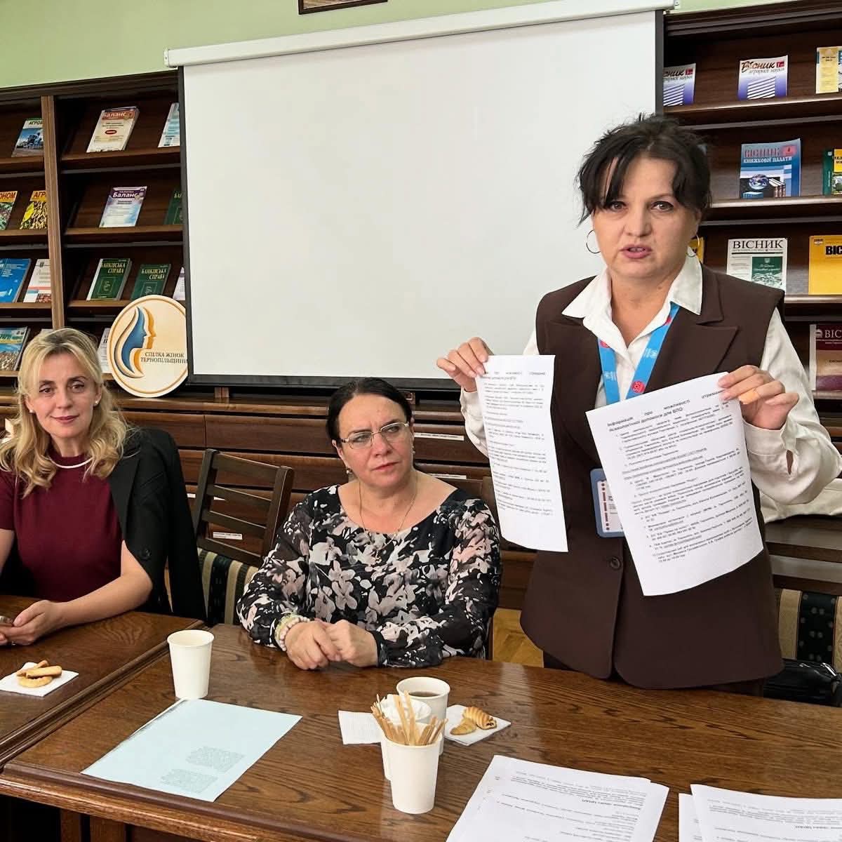 Також учасниці отримали інформаційні матеріали від регіональної координаторки громадської організації «КримSOS» Ірини Голяш. Потім завідувачка читального залу і членкиня Спілки жінок Тернопільщини Ірина Любезна поділилася досвідом щоденної роботи з ВПО, а керівниця культурно-мистецького напряму Наталія Марків презентувала проєкт «Поезія для змін», у якому жінки-поетеси зможуть проявити себе вже цієї осені.